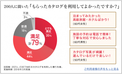 今回のお客様の声からもわかるように、当社が行ったアンケートでは、EXETIMEを貰った方の8割から「満足」とご回答いただいております。