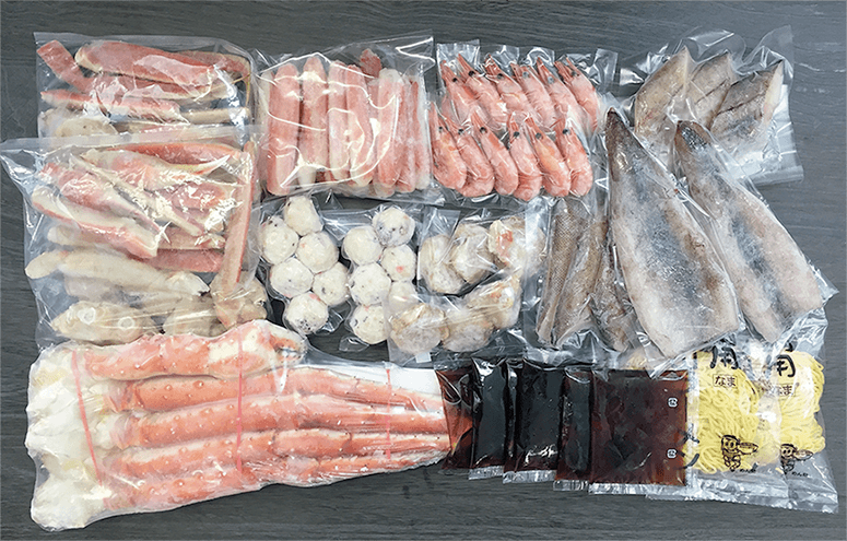 | 商品内容 | ゆでずわいがにカット800g、生ずわいがに棒ポーション400g、ゆでたらばがにセクション800g×1肩、ボイル海老12尾、ボイル帆立6個、かに入つみれ12個、ツボ抜きいか100g×2尾、助宗鱈切身40g×6切、冷凍生ラーメン80g×2玉、たれ(濃縮:醤油仕立て)50?×6袋 |